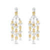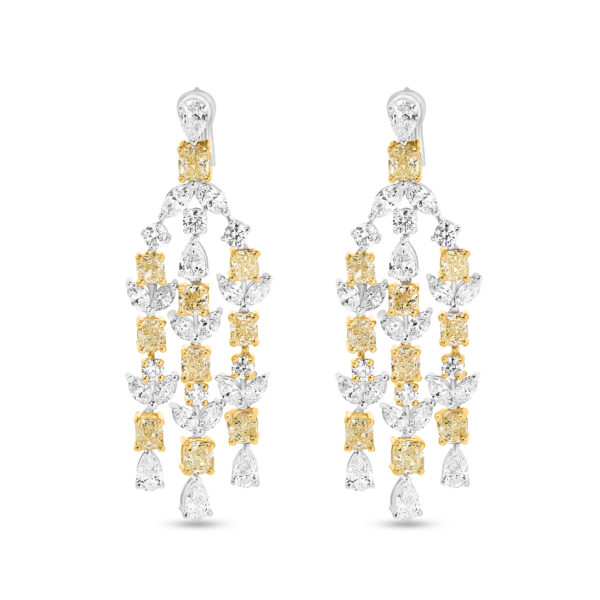 The Flying Harmonia Earrings custom made in 18K White Gold featuring Round diamond, Marquise and Fancy Yellow Diamond weighing 24.60 carats combined total weight with F Color and VS1 Clarity.