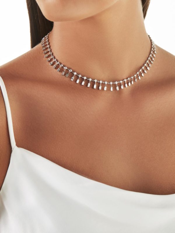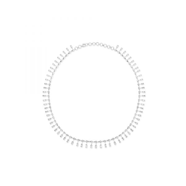 The Luxurious Cleopatra Necklace custom made in 18K White Gold featuring Round and Triangle Diamond weighing 4.05 carats combined total weight with F Color and VS1 Clarity.
