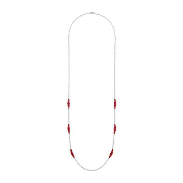 The Sparkle Sister Eos Necklace custom made in 18K White Gold featuring Round Diamond and Ruby weighing 5.44 carats combined total weight with F Color and VS1 Clarity.