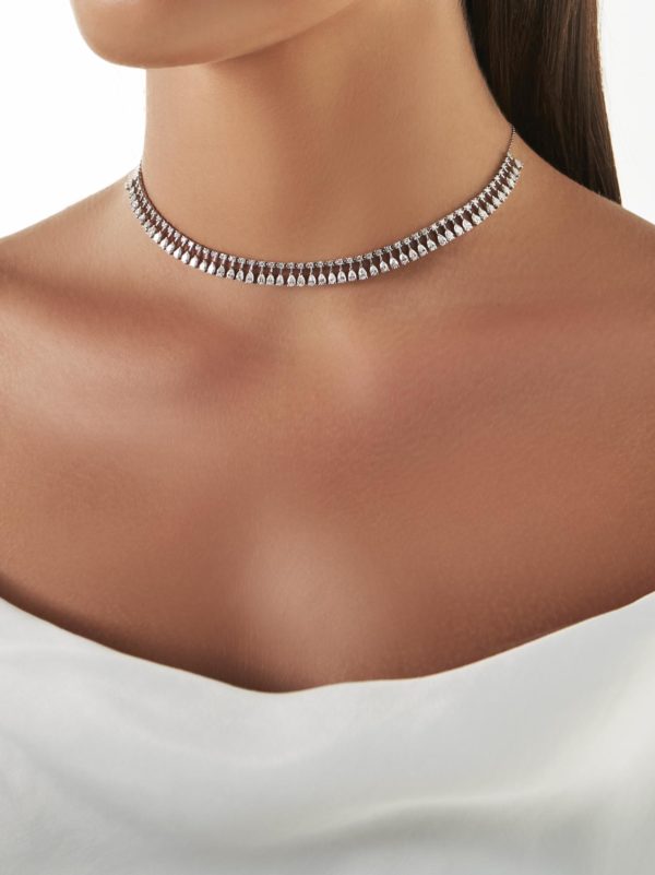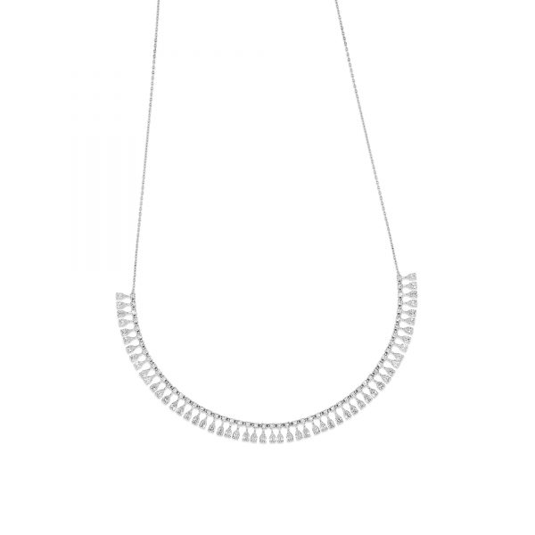 The Twinkling Waterfall Necklace custom made in 18K White Gold featuring Round and Pear Diamond weighing 5.10 carats combined total weight with F Color and VS1 Clarity.