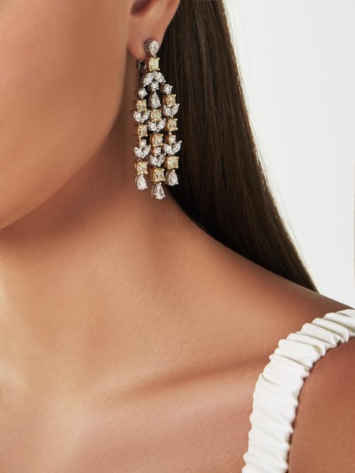 The Flying Harmonia Earrings custom made in 18K White Gold featuring Round diamond, Marquise and…