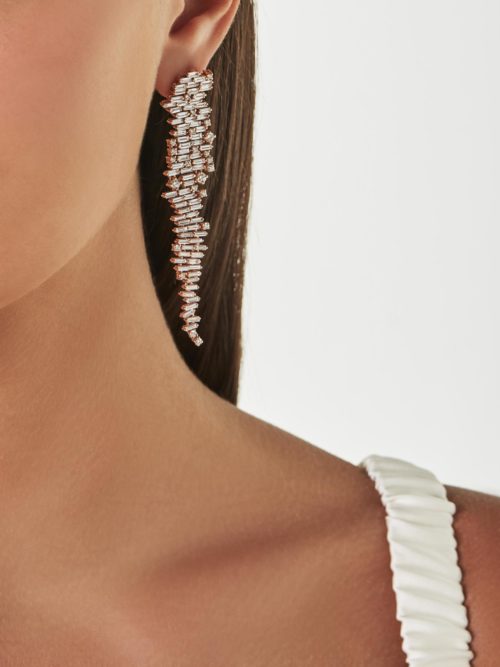 The Mysterious Constellation Earrings custom made in 18K Rose Gold featuring Round and Baguette Diamond…