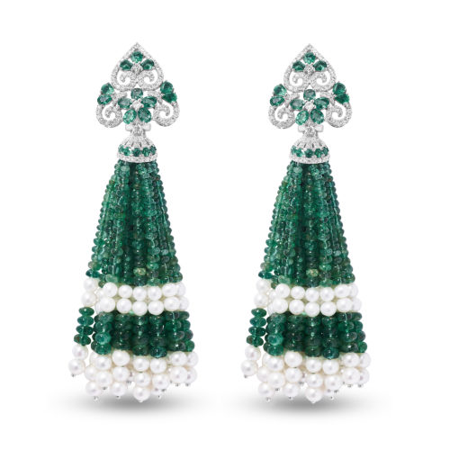 The Lady of Nature Earrings custom made in 18K White Gold featuring Pearl, Emerald and…