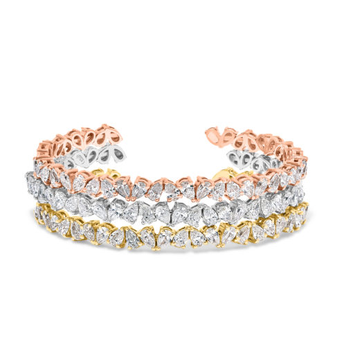 The Shimmering Droplets Bracelet custom made in 18K White Gold featuring Round, Pear and Marquise…